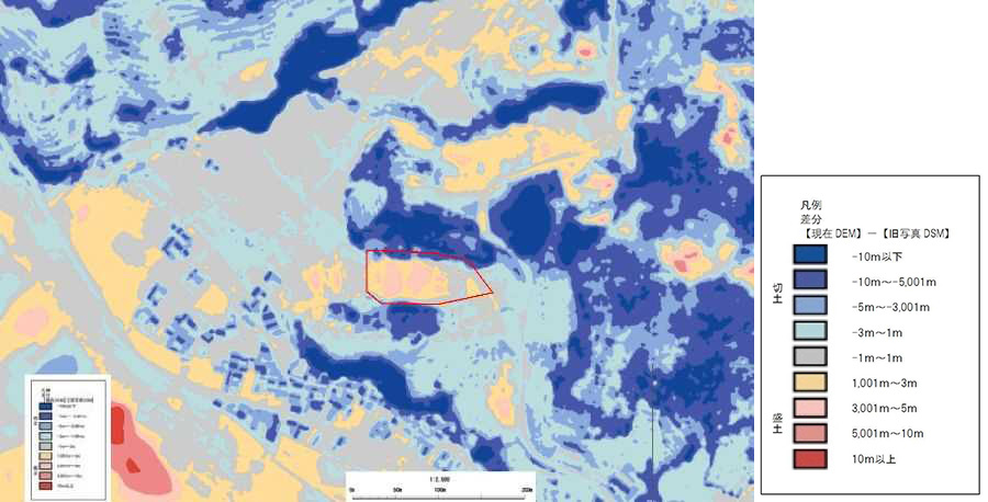 DEM 解析では、水面や樹木成長度合の違いによるノイズが多く含まれたが、下図のように空中写真と重ね合わせることで、盛土の可能性が高い箇所を特定した。NDVI 解析では、植生差がある箇所を盛土の可能性がある箇所とし、人工的な地形変化を確認した。