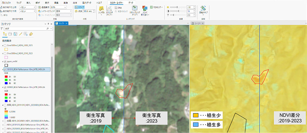 (2)光学衛星画像の解析:植生の健康状態を示す数値である NDVI 値の差分を解析し、植生の変化を確認した。