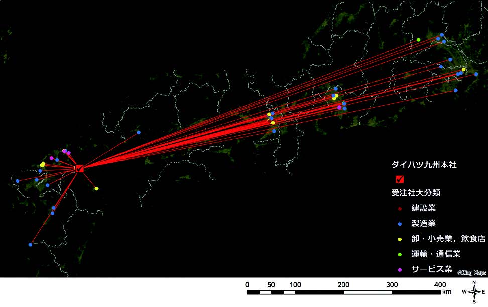 自動車産業は部品点数が多く、すそ野が広いことが特徴であり、完成車工場だけでなく、関連部品産業が周辺に立地する傾向がある。そのような複雑な産業構造を有する自動車産業を対象として、今回は大分県中津市に立地するダイハツ九州を取り上げ、実際にどの地域の企業からさまざまな資材・部品やサービスを調達しているかを、地図によりビジュアルに示すことから始めた。