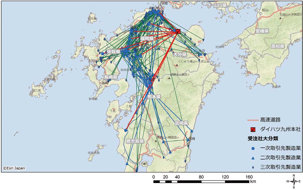 帝国データバンク保有の企業概要データベースに含まれる発注企業、および受注企業の本社住所を位置情報として地図上にプロットし、取引関係を可視化する。ダイハツ九州と直接取引している企業を一次取引、一次取引先と取引している企業をP R O F I L E二次、さらに二次と取引している企業を三次とし、そのサプライチェーンを捉えることを試みた。