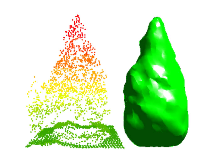 広域の森林バイオマスを効率良く把握するには、航空機レーザーが向いているが、航空機レーザーの欠点として樹冠表面からのレーザー反射が多くなり、バイオマス算出に必要な幹部形状を詳細に把握できない。そこで地上レーザーを用いて幹形状を把握できるようにした。