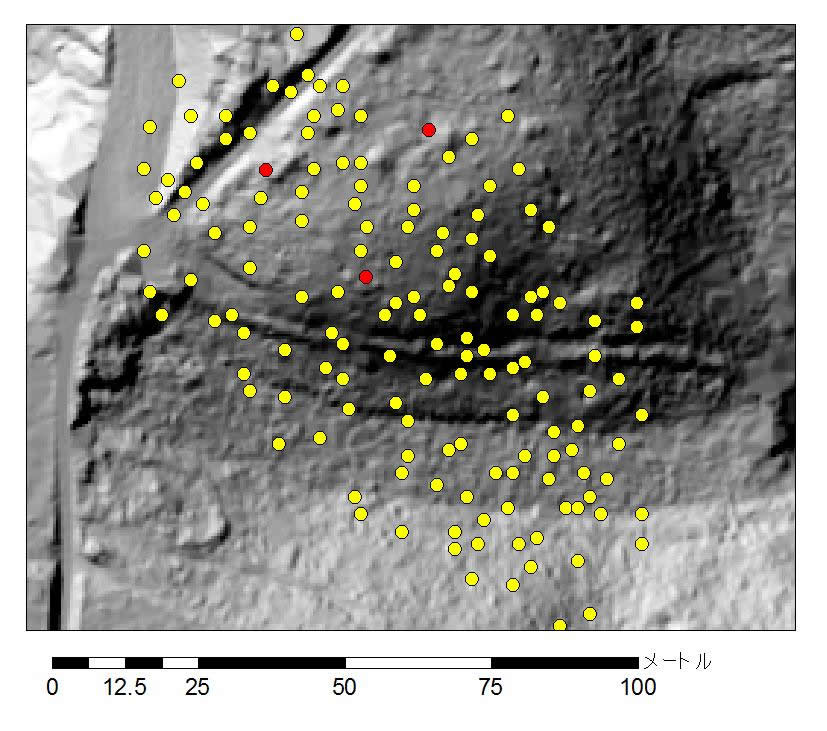 (黄色点が地上レーザーにより作成された樹木位置図、