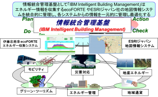 情報統合管理基盤の構築は、全体調整と ArcGIS の実装をアイ・エム・サービス株式会社、クラウドサービスの実装を伊藤忠テクノソリューションズ株式会社、ecoFORTEと呼ばれる、スマートメーターと連動するエネルギーデータ管理システ ムの構築を伊藤忠商事株式会社、そしてエネルギーデータや、地理情報などを集約・統合してダッシュボードに表示するポータルサイト、IIBM(IBM Intelligent Building Management)の構築を日本IBM株式会社がそれぞれ担当した。