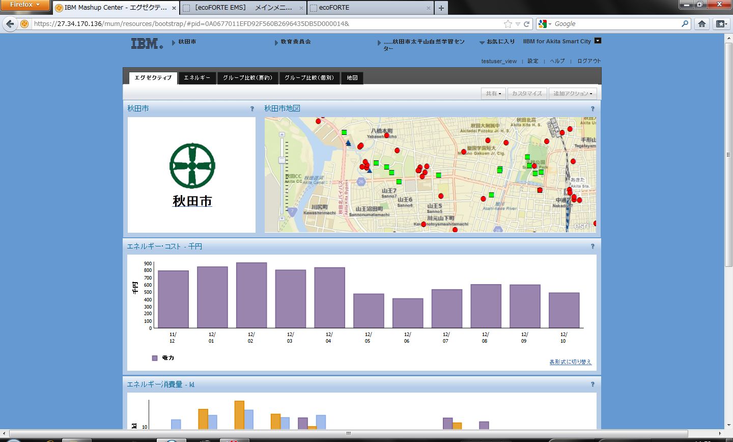 環境部は、エネルギーデータなどを基に ArcGIS for Desktop(旧 ArcView)で各種主題図を作成し ArcGIS for Server にアップロードする。アップロードされた主題図は ArcGIS Online で無償提供されるストリートマップとマッシュアップされ IIBM ダッシュボード上に ecoFORTE から転送されるエネルギー使用状況を示すグ ラフなどと共に表示される。システムはクラウドサービス上に構築されており、職員はどこからでも情報統合管理基盤にアクセスできる仕組になっている。