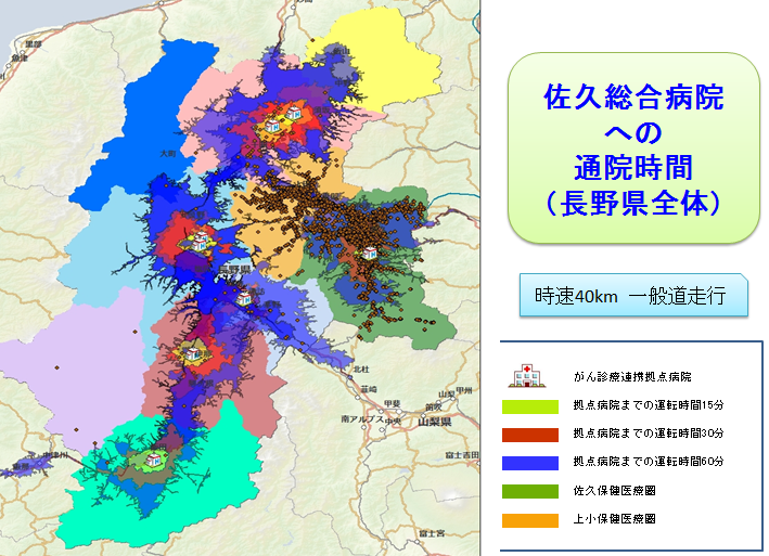 当初は地域ケア科の小松裕和氏が研究目的で ArcGIS for Desktop( 旧 ArcView)1 ライセンスを購入し分析を行っていた。その成果は病院と佐久診療圏の現状を示す基礎データとして蓄積されていった。その後、小松氏が作成したマップを学会で発表の他、病院内での共有、意思決定会議などでの使用につれ、徐々にその有用性が病院経営層へも浸透していった。2012 年 3 月には職員への GIS オンサイトトレーニングが実施され、現在は Esri Business Analyst を導入し、管理課、診療情報管理科との共用・管理が始まっている。院内各部署・各診療科や医師からの依頼による分析・マップ作成業務の他、調剤薬局マップの作成など患者へのサー ビスとしての GIS 利用も計画している。