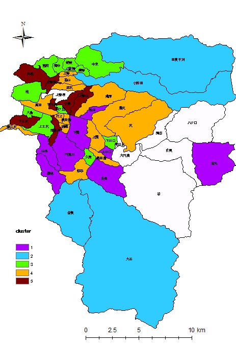 2005 年の農林業センサスのデータをもとに、農家、農業労働力、経営、土地利用等に関する指標に生活利便性を加味した 42 個の指標を設定し、因子分析(バリマックス回転)を行った。生活利便性の測定には ArcGIS for Desktop Basic (旧 ArcView)と ArcGIS Network Analyst を使用した。その結果、第 8 因子までで、累積寄与率が 73% に達した。第 1 因子には生活利便性、第 2 因子には兼業農家が抽出された。第 1 因子の因子得点が高い集落(生活利便性がよくない)はやはり周辺部に位置する 大石、小和田、田麦干刈などであった。この因子分析の結果をもとにクラスター分析(k-means 法)を行った。周縁部に位置する集落が同じクラスタとなり、他は近隣の集落が 1 つにまとめられている (図 3)。