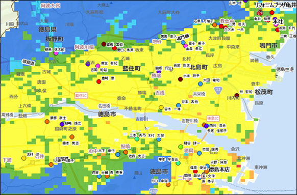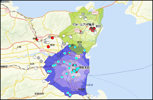 GISを用いたハザードの可視化は、まず近い将来直面する可能性のある「東海・東南海地震」を第一のハザードと定めて行われた。内閣府中央防災会議が平成24年8月に発表した「南海トラフ地震リスクデータ」をArcGISに取り込み、徳島県下のリスク状況を確認した。さらにその上に、亀井組の営業拠点、避難所、社員の自宅、顧客、主要取引先(下請け企業など)の位置を、住所情報からジオコーディングして各種レイヤに展開した。