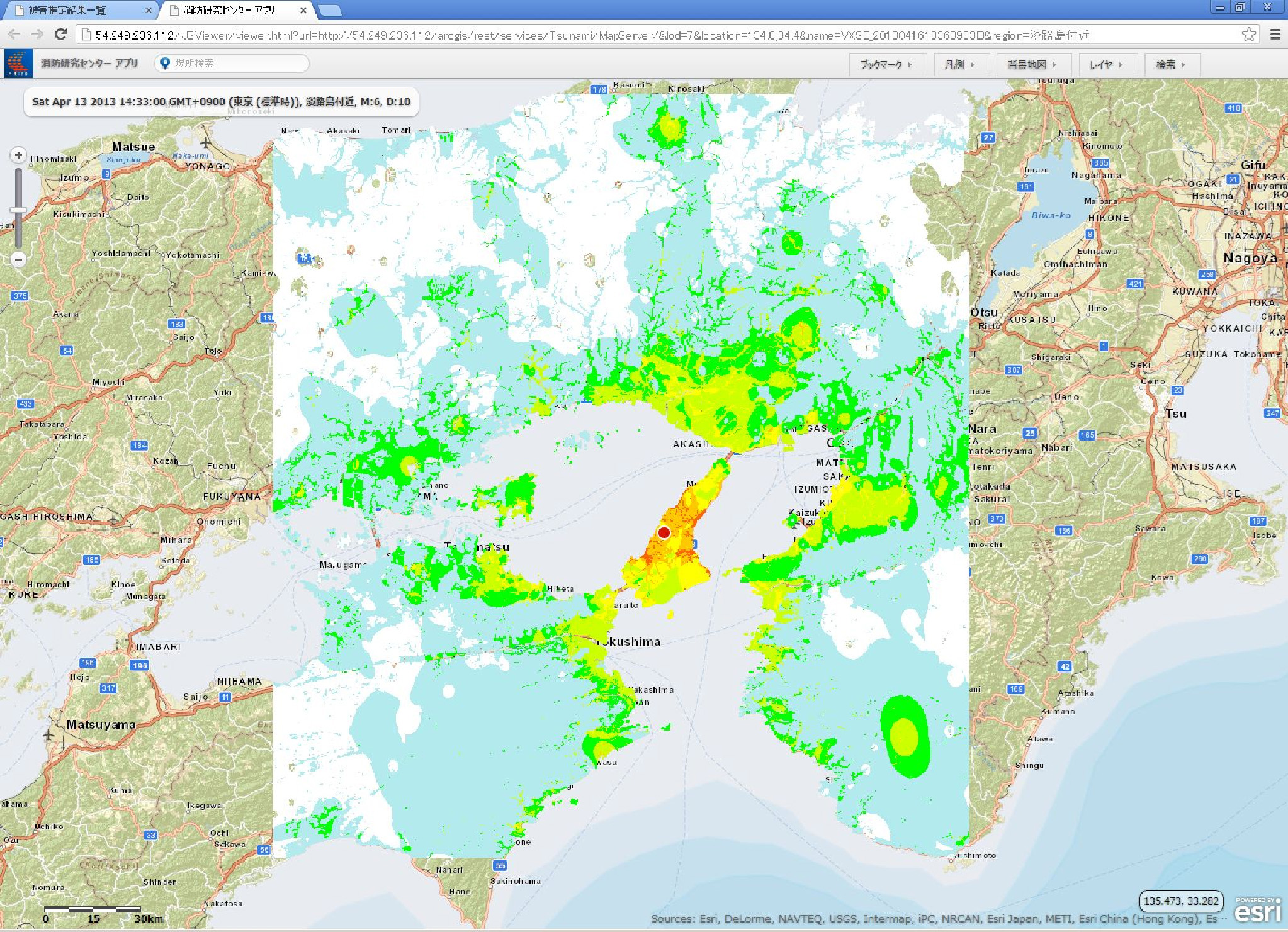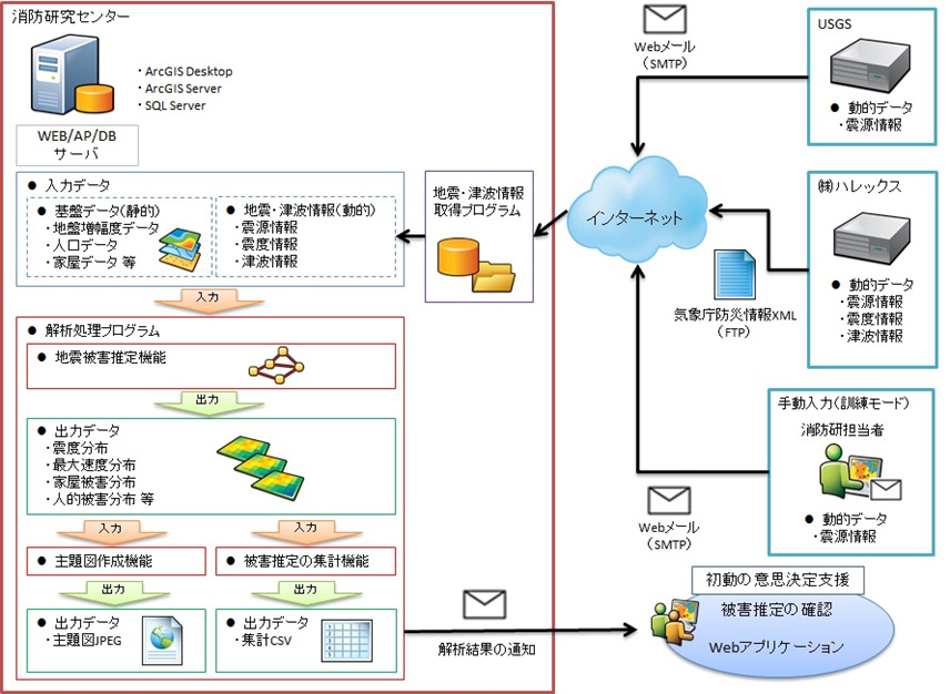 解析結果はArcGIS for Serverを介しWebで公開される。またそのURLを電子メールで関係者に通知し、URLのリンクから結果を確認することができる。またWebマップとは別に主題図を作成するプログラムによりマップ(画像)および被害の市区町村別集計結果(CSVファイル)も作成され、同じくWebサイトから確認することができる。また、このシステムは変化する情報に対応した被害推計システムである。地震直後の震源情報等により最初の被害予測が計算されるが、その後時間の経過とともに更新される震度情報に基づき被害推計が随時更新され、更新ごとに関係者には電子メールで通知されるのである。