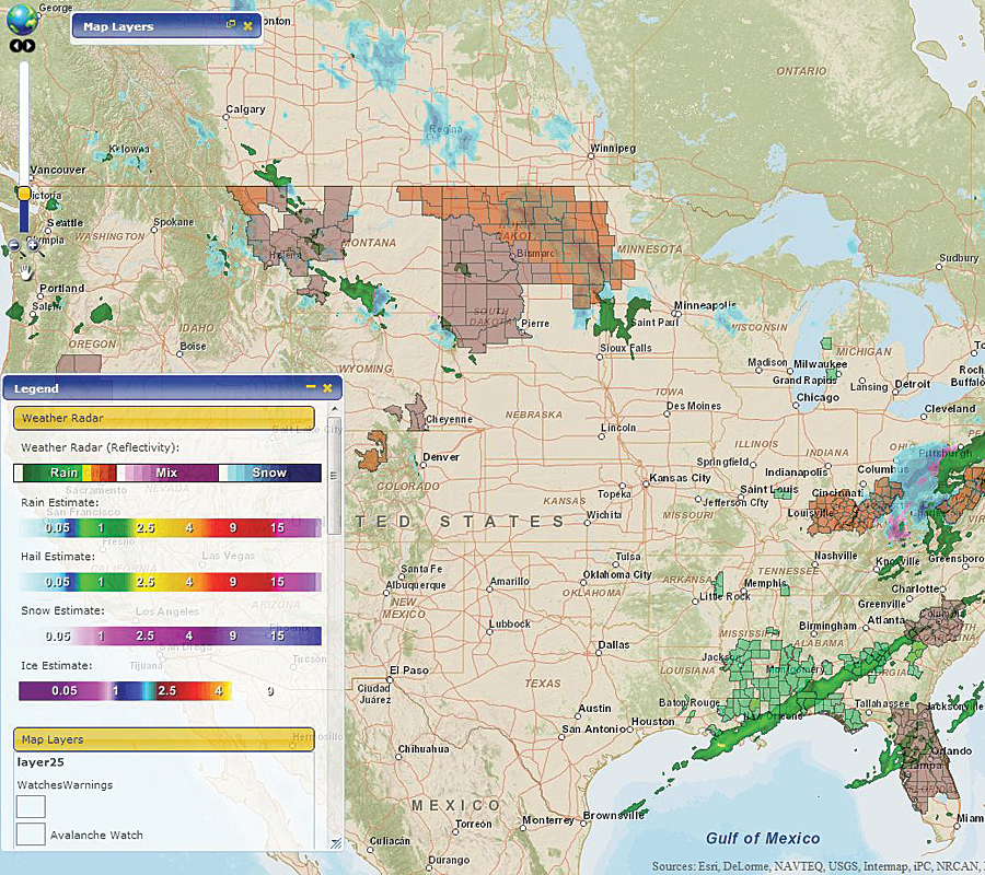 気象に関するデータは災害モデリングに欠かせない情報の一つである。PLRBはレーダーによって観測される降水量の詳細、時間帯別の雨や雪、雹の予報を含むリアルタイムのデータを取得できるようなシステムを作り上げた。このシステムは現在の風の状況を含む詳しい専門的な情報も把握できる。竜巻などの大きな被害が予想される気象現象が起こったときに、PLRBメンバーは刻々と変化する風の状態を検索できる。北アメリカの分析には、ナショナルハリケーンセンターから発表される熱帯暴風雨や竜巻、暴風津波圏エリアのデータをはじめとする湾岸や東海岸の天候を大きく左右するリアルタイム情報と過去の情報が不可欠だった。「PLRBマップは風速や竜巻の情報など様々な情報を組み合わせて、すべての気象予測に使うことができる」とストラウン氏は述べた。