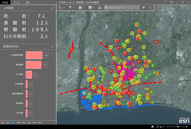 訓練中には災害対策本部の活動方針を決定する本部員会議も開かれた。ここでは災害対策本部の本部員が被害や応急対応の最新の状況を概観し、迅速で適切な判断が求められるため、マップに加え集計情報をグラフ形式などで可視化するのに適したOperations Dashboard for ArcGISを使って効果的な情報共有が実現された。