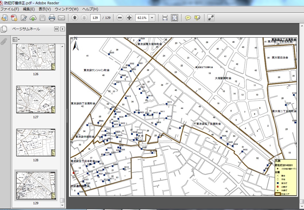 GISデータ化した防犯灯の情報をArcGIS Onlineを利用して共有し、スマートフォンを用いて現地調査を行った。その調査結果を反映した地図をArcGIS for Desktop の図郭印刷機能を使用して町会ごとに出力し、各町会と電力会社にも確認を依頼することで適正な助成金の支出につなげることができた。防犯灯新設の際にも紙地図をGISデータに変換した後、Collector for ArcGISを使用して現地調査を行うことで現場の写真を添付した調査結果をクラウドに即時にアップデートすることができ、庁舎に戻ってからの修正やデータ整理の作業にもほとんど時間を要することなく効率的に調査が行えた。