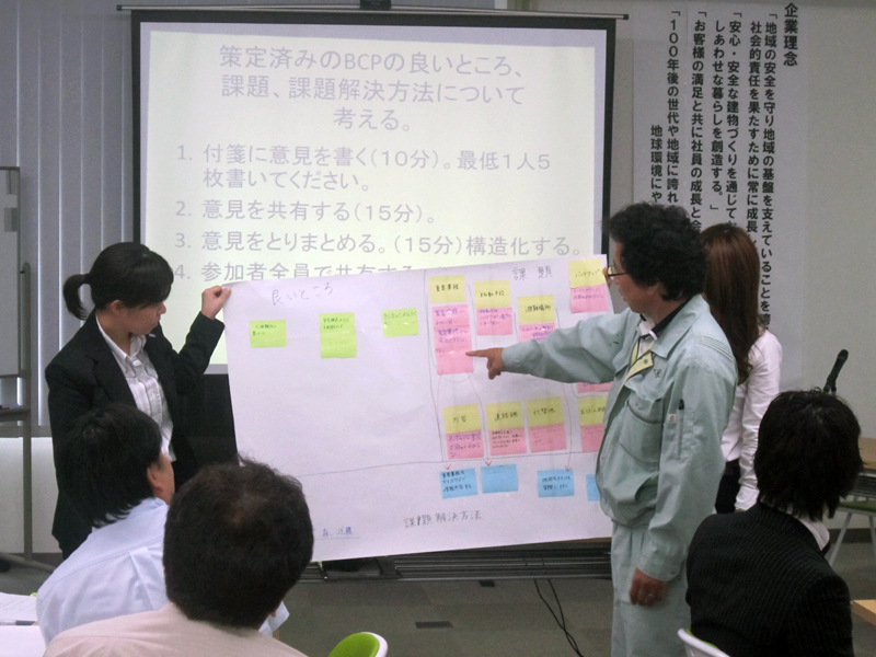 亀井組では、平成25年より、BCPの策定にワークショップを取り入れている。社員一人一人のBCPに対する参加意識(我こと意識)を高め、有事の際に機能する体制を作ることが目的である。ワークショップでは、亀井組の主な事業が、「東海・東南海地震」で受ける被害により、どのような影響をもたらし、その結果、事業を継続していくうえで必要となる作業項目について話し合われた。