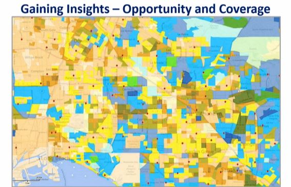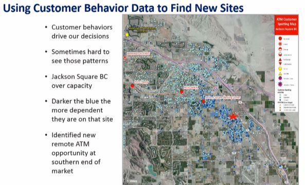 また、支店や ATM の出店・移転といった意思決定にも地図による分析が有効的だ。サウスパームスプリングス地域の顧客分布と支店・ATM の利用状況を分析したところ、半数もしくは全ての取引をジャクソンスクエア支店と ATM で行う顧客が多いことがわかった。加えて、この支店では取引のキャパシティが限界に達しており、一部の顧客取引を別の支店や ATM に移す必要性があることが判明した。では、どこの支店・ATM に顧客を誘導すればよいのだろうか。ジャクソンスクエアだけを利用している顧客の分布を分析した結果、ATM を 2.4km から 3.2km 南に移すことで状況の改善が図れることが明らかになった。ジャクソンスクエア設備を増強するのではなく、多くの顧客が居住する地域に設備を設けることで課題解決が図れることがデータの可視化によって導きだされた。