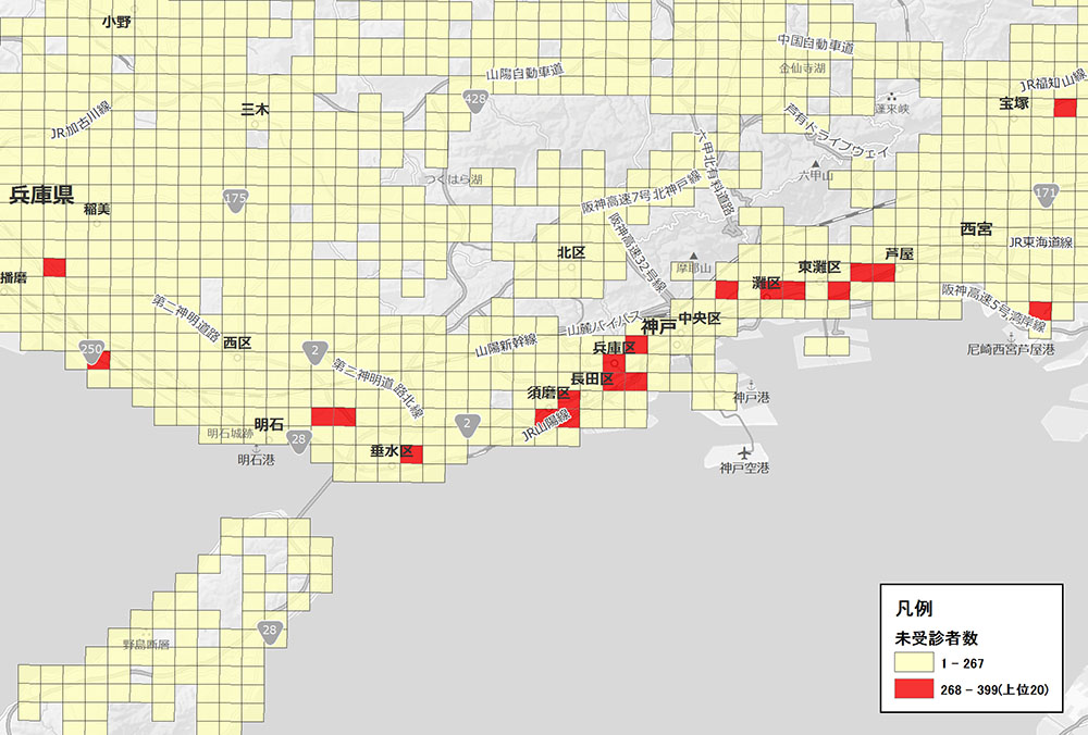 GISの機能で未受診者の分布を視覚的に把握できるばかりではなく、1kmメッシュを用いることで数値的にも把握することが可能になった。
