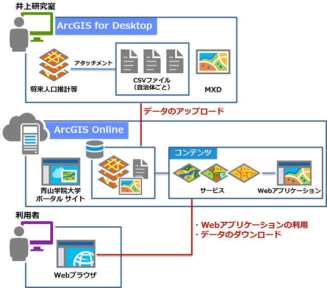 青山学院大学 経済学部 井上教授は、自治体を支援するシステムとして「全国小地域別将来人口推計システム」を公開した。本システムは青山学院大学で導入している ArcGIS サイトライセンスを利用し、ArcGIS for Desktop でデータの整備や将来人口推計の計算を行い、ArcGIS Online で Web 上に公開した。2015 年から 2060 年までの5年ごとの小地域別将来人口推計を日本全国で網羅しており、このようなデータの公開は日本で初めての試みである。