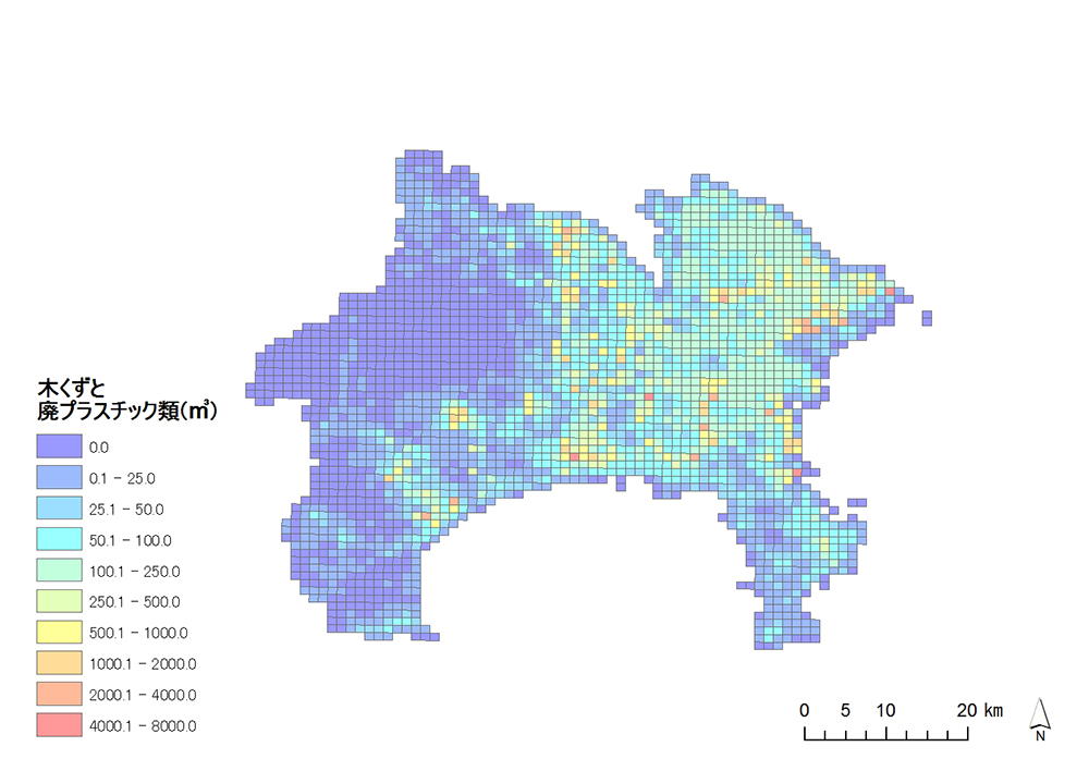埼玉県及び神奈川県を対象地域として事例研究を行った。それぞれの地域の1kmメッシュ単位の廃棄物発生分布を推計し、Network Analystのロケーション-アロケーション機能により、排出場所と仮定した各メッシュ中心から施設までの総輸送距離を解析し、最小となる地点を最適地とした。対象廃棄物は、神奈川県では木くず類及び廃プラスチック類とし、埼玉県では、木くず類のみとした。