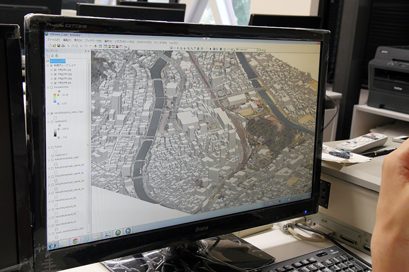 そうしたなか、当時、ビルや駅など様々なものに映像を投影するプロジェクションマッピングという表現方法が注目を集めていた。また、メディアアートが専門で、3D表現に関心を持つ同学部の河原崎准教授と共通の興味・関心から意気投合した。その年、総合科学部の新任教員のために設けられた学内の研究助成である創生研究プロジェクト「GISと3次元都市モデルデータを援用した津波被災想定地域のシミュレーション」が採択され、塚本准教授と河原崎准教授との共同研究が始まった。まさに学部の特性を生かした分野を横断した共同研究がスタートしたのである。