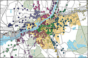 まず、データ入力スタッフがメインコンピュータシステムに翌日の配達のための情報を入力します。その情報は自動的にArcGISサーバーにロードされ、そこで届け先住所がジオコーディングされて、マップと照合され、どの配送地区に属するか決定します。配送地区は、ルートやドライバーを基に作成されます。これらの配送地区はその後、割り当てルールとドライバー入力に基づき個々の一日の配送計画へと細分化・最適化されます。すべてのデータは携帯端末とLANを介して施設全体で共有できるため、スタッフはすべてのデータにいつでもアクセス可能です。