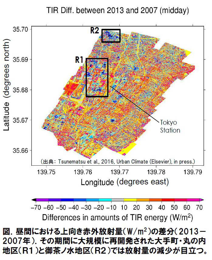 昼間における上向き赤外放射量の差分を地図上に可視化した結果、都心エリア、特に再開発が行われた場所では、緑化や屋上面の変化、水辺、ビル陰の形成などによる真昼の熱赤外放射量の減少が目立った。真昼の熱赤外放射量は、相対的に密集住宅地で多く、オフィスビル・商業施設で少ない傾向にあることが分かった(この研究結果は、都市気候に関する国際科学雑誌である「Urban Climate」の Vol.17 に掲載されている)。