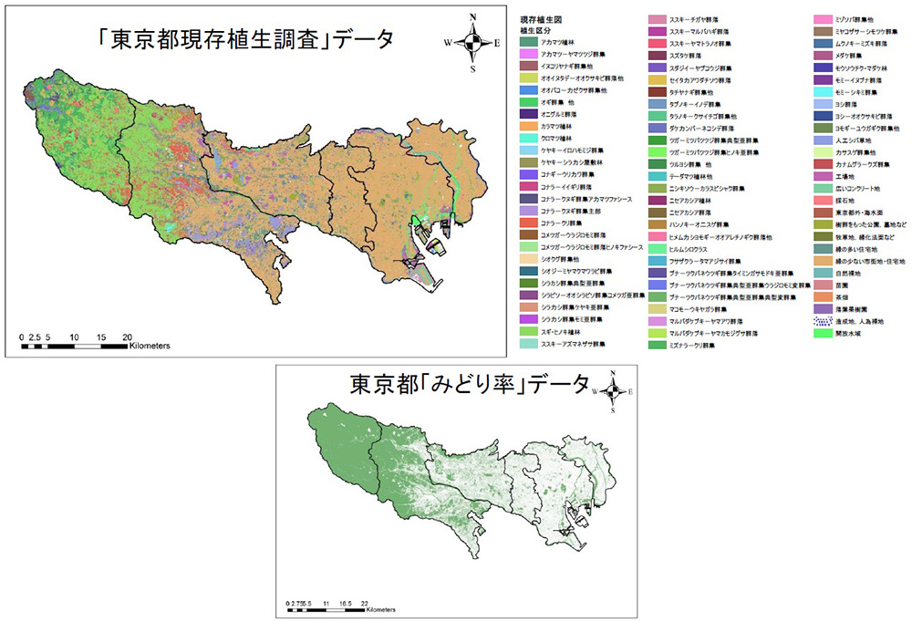 東京都の既存調査データ(東京都現存植生図、みどり率データなど)や外部の既存調査データ(林野庁森林資源モニタリング調査、 環境省自然環境局自然環境調査)をもとに GIS による空間分析を行い評価指標を洗い出している。これらを基本項目とし、さらに加点項目を加えスコアリングすることにより新たな緑指標について研究している。この研究は千葉大学の協力を得て実施している。