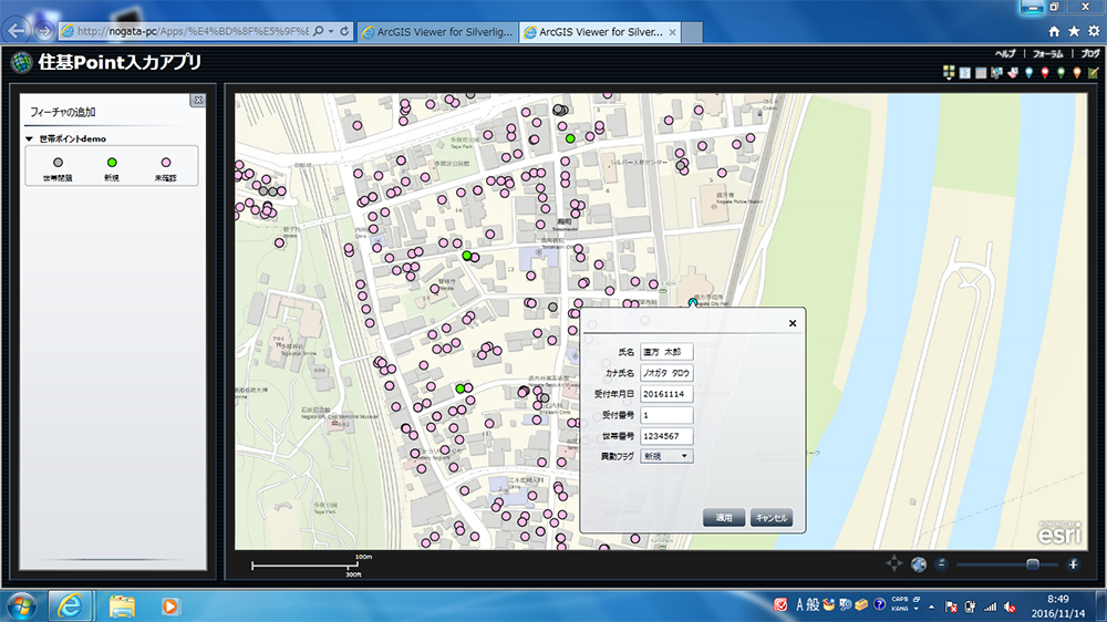 実用に耐えうる住基ポイントデータを構築するため、住民の異動受付窓口(市民課)に来られた住民の方に位置を確認してもらいながら、正確な位置情報をリアルタイムに更新できる仕組みづくりに取り組んだ。 まず、受付窓口で実際に行われている住民異動のパターンを洗い出すと非常に複雑で、現在の受付業務に加えてアプリケーションに入力する手間が大幅に増え、業務を圧迫する恐れがあった。 そこで、受付窓口で実施できる基本的な3つの住基ポイントの異動ルールを設けた。 1つ目は、「市外からの転入」等、新たに「世帯(世帯番号)」ができる場合はポイントを作成する。2つ目は、「市外への転出」、「死亡」等により、「世帯人員」が“0”になった場合にはポイントを閉鎖する。3つ目は、「市内での転居(全転居)」の場合には、転居先にポイントを作成し、転居元のポイントを閉鎖する。上記3パターンであれば、春先の異動が多い時期でも通常業務を圧迫することなくスムーズに対応が行えた。 また、ポイント入力のほかに受付窓口で入力する情報は「受付年月日」と「受付番号」のみで、個人情報は含まれていないという点も、市民課窓口での導入が実現した要因の一つである。 後に「世帯番号」が発行された際には追加されているポイントに「世帯番号」を付与している。