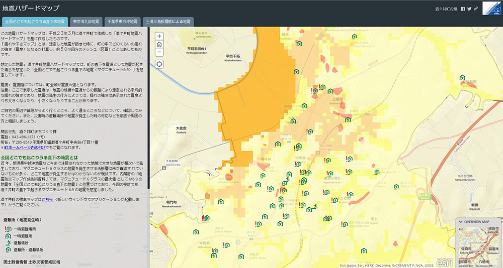 緊急時に役立つハザードマップは、地震ハザードマップと洪水ハザードマップがある。地震ハザードマップは、想定される4つの地震別に(直下型地震・東京湾北部地震・千葉県東方沖地震・三浦半島断層群の地震)震度予測や避難場所の案内等を表示して、防災情報の一元化と配信を行っている。