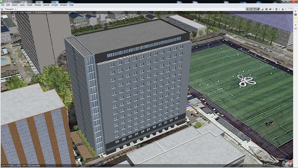 ② 作成したデータを Esri CityEngine に読み込み、建物の高さ情報をもとに 3 次元の建物として表示する。