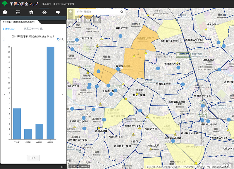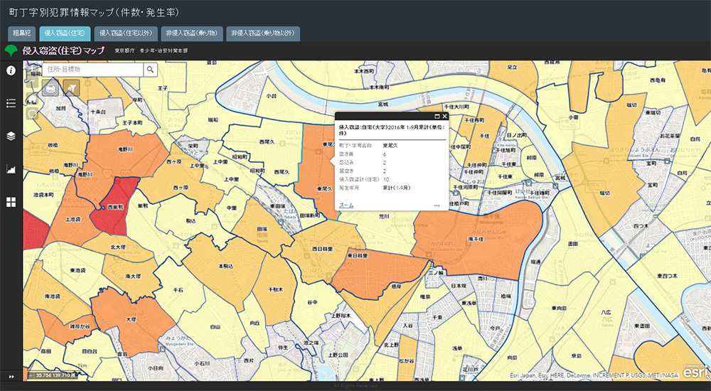 東京都青少年・治安対策本部では、区市町村の取り組みや防犯ボランティア団体等の活動支援として、防犯ポータルサイト「大東京防犯ネットワーク」を運営している。平成 28 年 10 月に、地域の一層の治安向上を図り、警察や行政だけでなく都民や防犯団体、民間事業者等の取り組みを一層促進するため、本サイトに GIS を導入して地図によりわかりやすく防犯情報を発信するサービスを開始した。本サイトは、ArcGIS Online が活用されており、データのテーマや想定される利用者に応じて、6 つの Web アプリケーションが掲載されている(平成 28 年 10 月時点)。