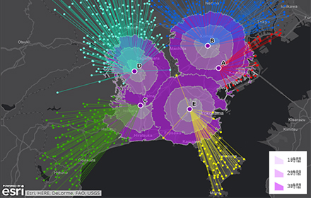 配送拠点を新設する場合、顧客数や、周辺のデポステーションのキャパシティを考慮する必要があります。ArcGIS の解析機能で、新規デポステーションの設置計画を効果的に支援します。