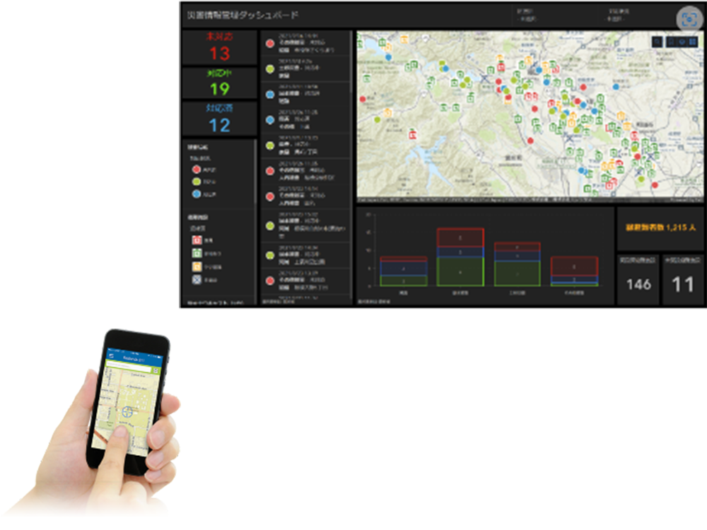 スマートフォンアプリから被害状況を入力することで、リアルタイムに被害状況等がダッシュボードアプリで一元的に確認ができ、迅速かつ的確な政策判断が可能となります。