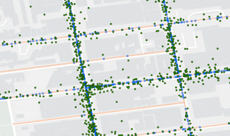 人流やカープローブデータは GPS や Wi-Fi、Bluetooth などの測位システムから取得しますが、その位置の揺らぎを補正するためにマップマッチング処理が必要となります。