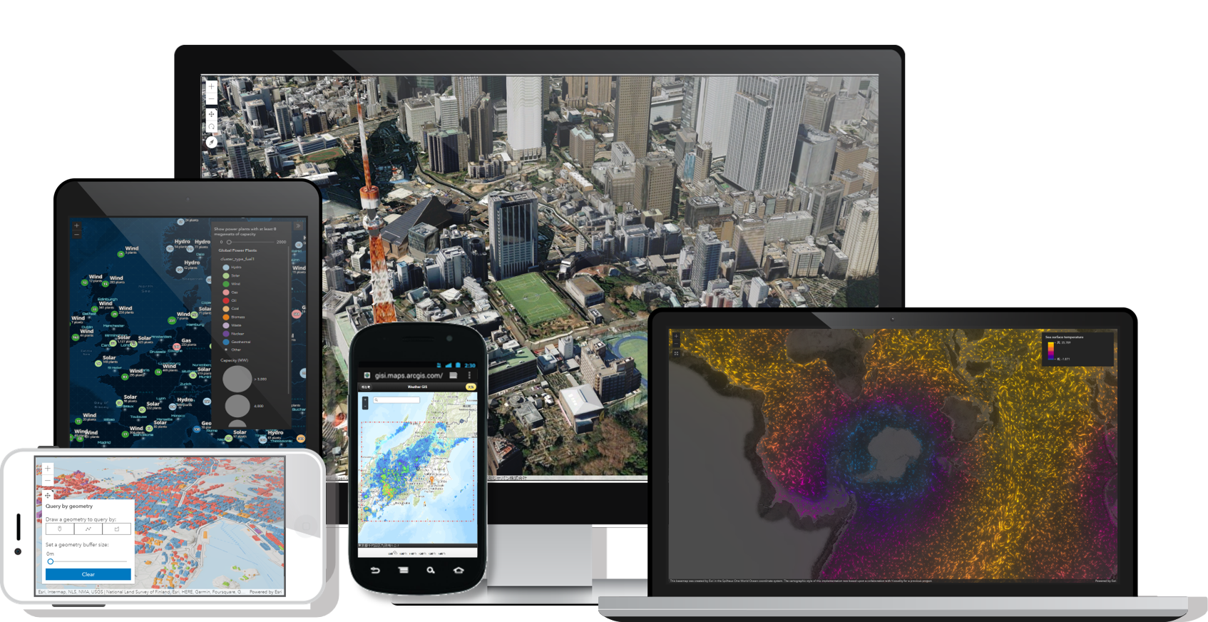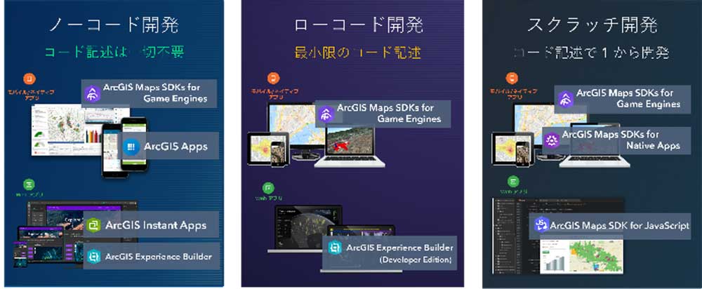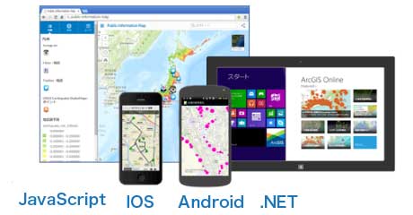 ArcGIS は、開発者のスキルやシステムで使用するデバイスにあわせて選択できる多様な開発環境を提供します。Web アプリや iOS, Android, Windows 向けのネイティブ アプリなど、あらゆる環境向けに地図アプリを開発することができます。