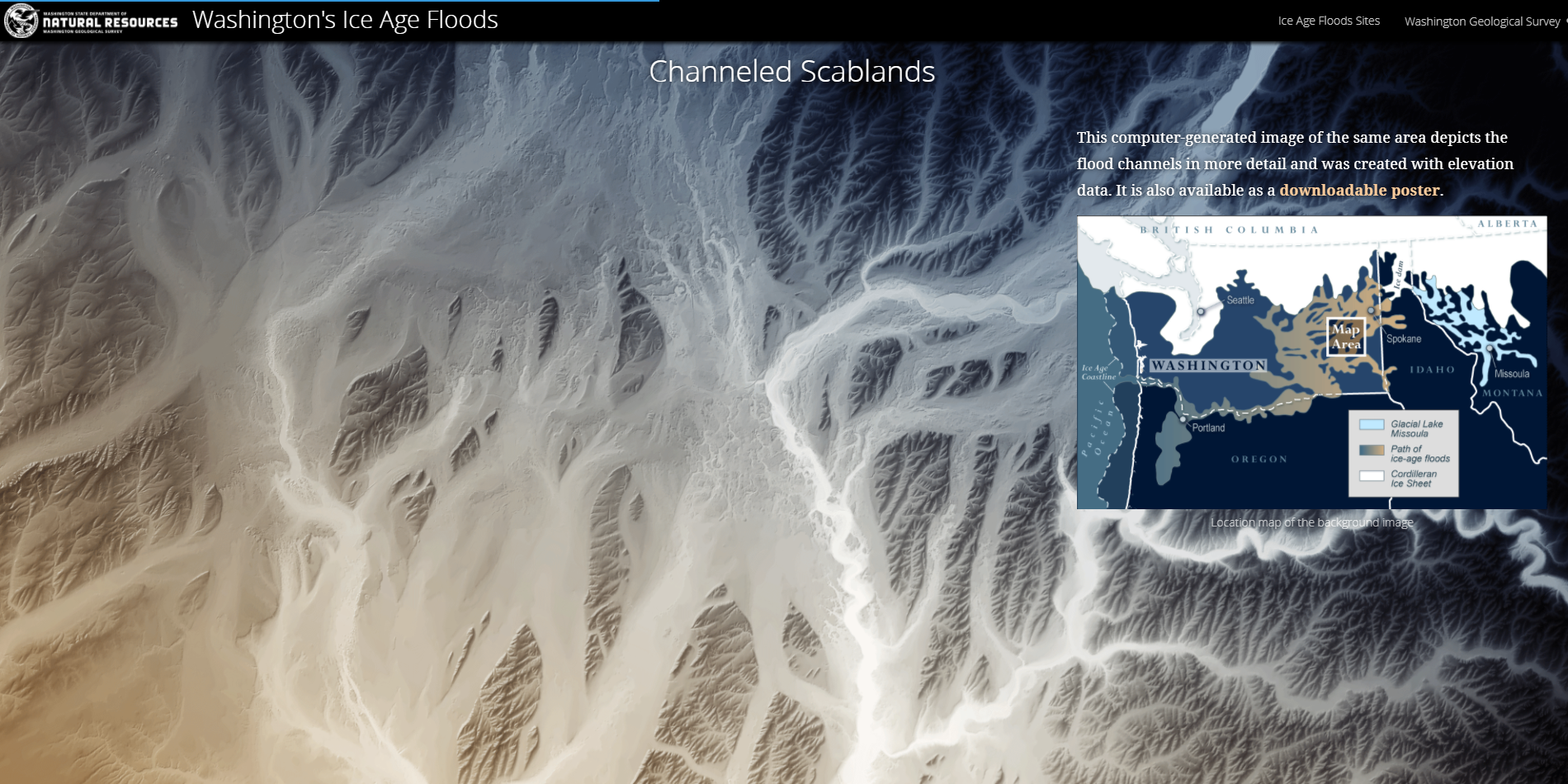 最優秀作品は、氷河期の大規模な洪水によって形作られた米国ワシントン州の ダイナミックな地形について解説したストーリー マップです。