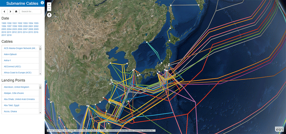 海底には私たちの生活に欠かせない通信ケーブルが、網の目のように張り巡らされているのをご存知ですか。世界で一番古い海底ケーブルは、なんと今から約 160 年以上も前の 1850 年代に敷設されています。今でこそ当たり前のよう国際電話をかけることや、世界中の Web サイトをインターネットで閲覧できていますが、これらもこの海底ケーブルがあってこそです。このマップから、どのように世界が繋がっているのかを見てみましょう。