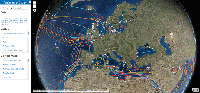 本マップは平面ではなく球体で表すことによってより直感的に分かりやすくなっています。ケーブルが敷設された年、ケーブル名や接続拠点にソートしてみることが出来ます。ホームボタンをクリックするとデフォルトに戻ります。また、地球を動かしているうちに方角が分からなくなってしまった場合は、方位のボタンをクリックすると北が上になります。