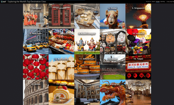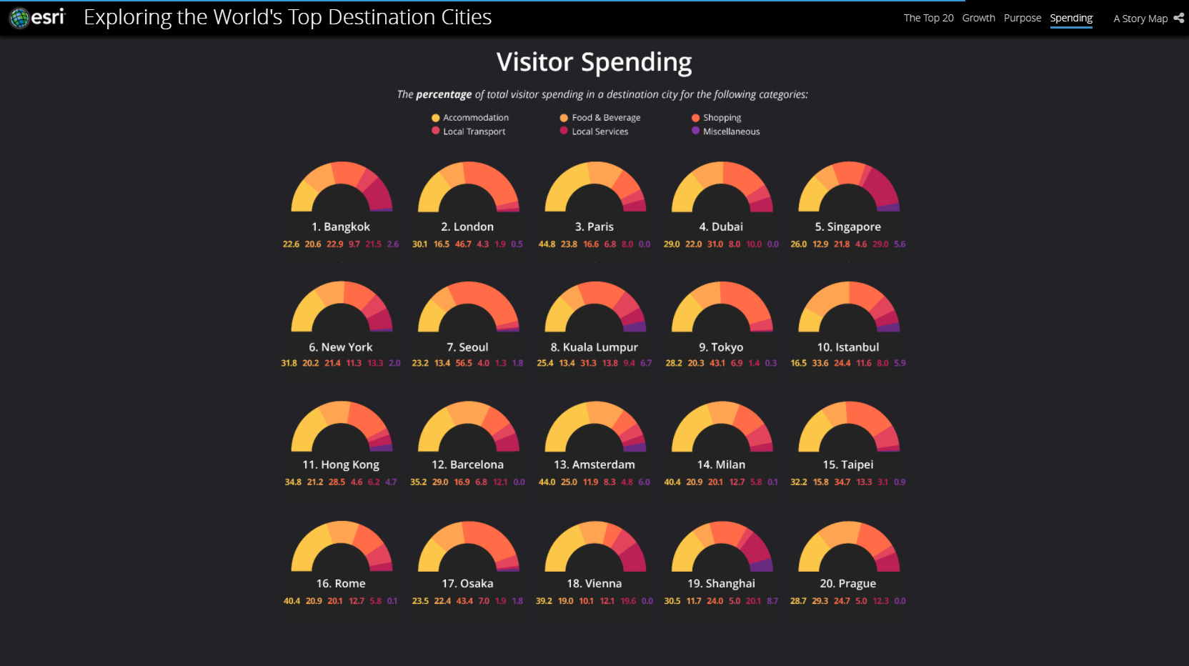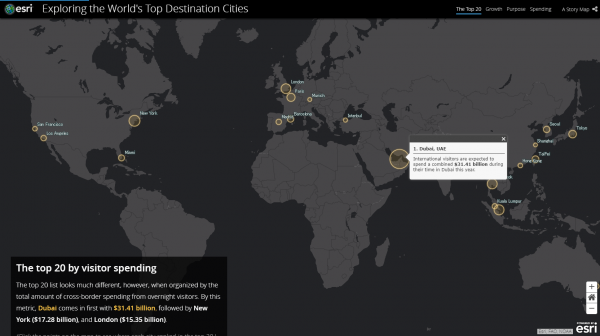 訪問者数のマップとは少し違った結果が見て取れます。1 位はドバイの 314.1 億ドルが海外からの訪問者によって使われています。続いてニューヨークの 172.8 億ドルです。
