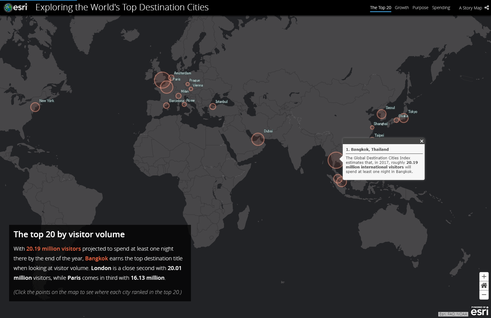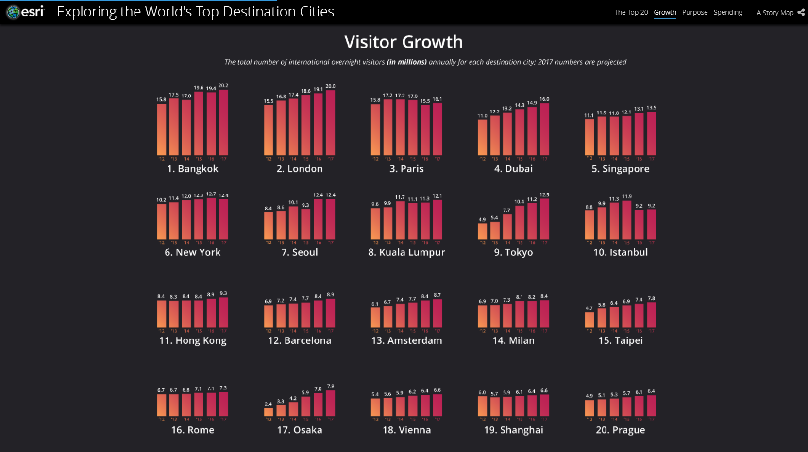 外国からの訪問者の絶対数ではえある 1 位に輝いたのはタイのバンコク。22019 万人の人々が2017年の年末までにバンコクを訪れると予測されています。2 位のロンドンは 2001 万人、そして 3 位のパリは 1613 万人が訪れると予測されています。(マップ上の〇をクリックすると、順位と予測訪問者数がご覧になれます)