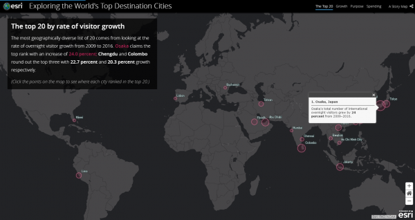 ここでは 2009 年から 2016 年までの訪問者数の増加率を比べています。24% の増加率で 1 位に上がったのは大阪。2 位は 22.7% で中国の成都市、スリランカのコロンボが 20.3% で 3 位でした。