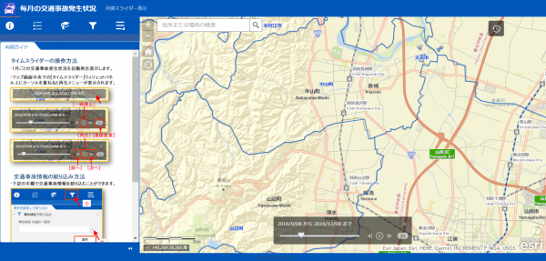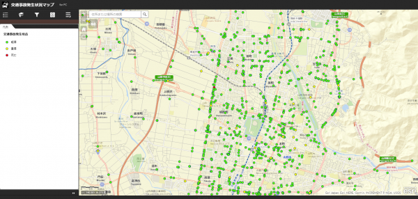 交通事故情報は、Web マップ形式で山形県警ホームページ上の「山形県警察本部マップギャラリー」で公開されています。今まで目に見えにくかった交通事故情報を、GIS を活用することで天候や時間帯、月別などの交通事故発生の分布状況を、地図上にビジュアルに表現することで直感的に把握することができます。また、交通事故情報のデータは出力・印刷できるようになっており、学校関係者、交通関係者やボランティア団体及び各種事業者の方が交通安全活動の資料として利用することができます。
