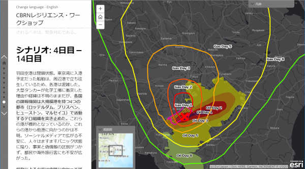昨年 10 月 23 日からの 3 日間で行われた危機管理の国際ワークショップである 「International Workshop CBRN Resilience ~時間とともに拡大する災害に対する国際協力枠組みの構築~」においてテロや災害発生時の状況認識統一を目的としてストーリーマップによる支援を行いました。 このワークショップでは、川崎港を舞台にしたタンカー衝突事故を発端とする東京湾全域と首都圏に及ぶ大災害発生シナリオに基づき、参加者を複数のグループに分けたディスカッション形式で行われました。大規模災害対応のシミュレーションにおいて、どのように地図が活用されたかをご覧いただけます。 詳しくはこちら