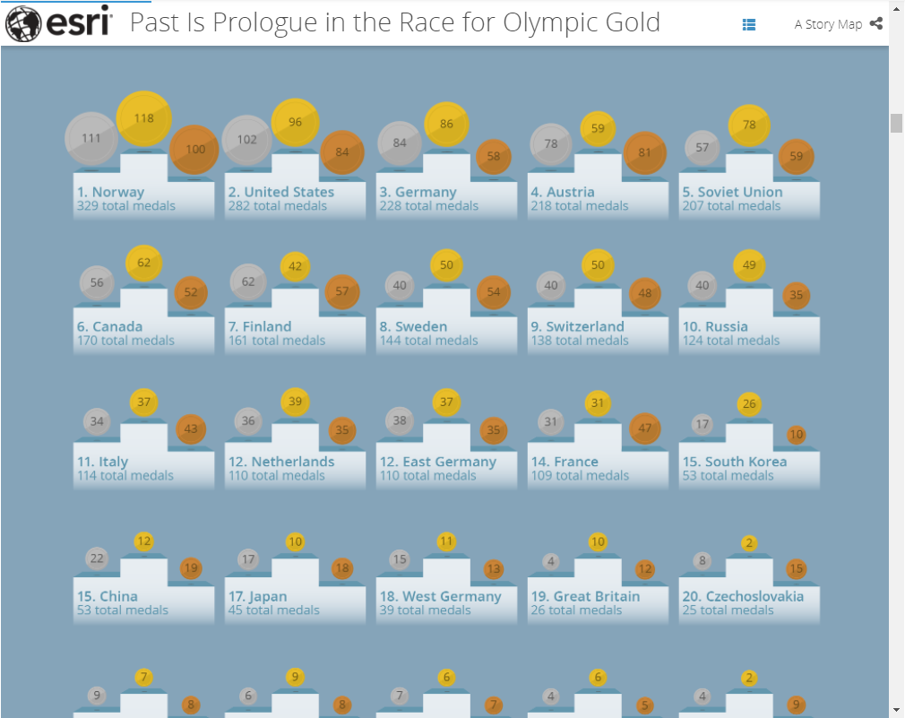 2. 数字で見る歴代冬季オリンピック このマップでは、歴代の冬季オリンピックで各国が獲得したメダルの数を人口や GDP と比較しながら紹介しています。