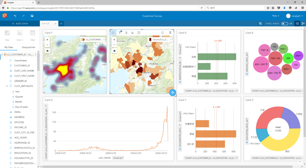 ブラウザー上でドラッグ & ドロップなどの直感的な操作で、Excel などのデータをグラフやマップに可視化・空間分析ができる Web アプリケーションです。ArcGIS Online で提供される背景地図や統計(GIS)データ、ジオコーディング(アドレスマッチング)、空間集約などの空間分析を活用することで、属性および空間的な視点からデータの特性を理解し、顧客特性の把握、立地の最適化などさまざまな意思決定、戦略立案を支援します。