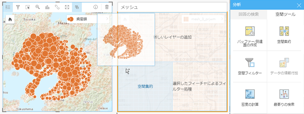 データの可視化に加え、エリア内のポイントを集約し件数を求めたり、データの密集具合を表す密度マップを作成したり、空間的な特徴を分析することが可能です。