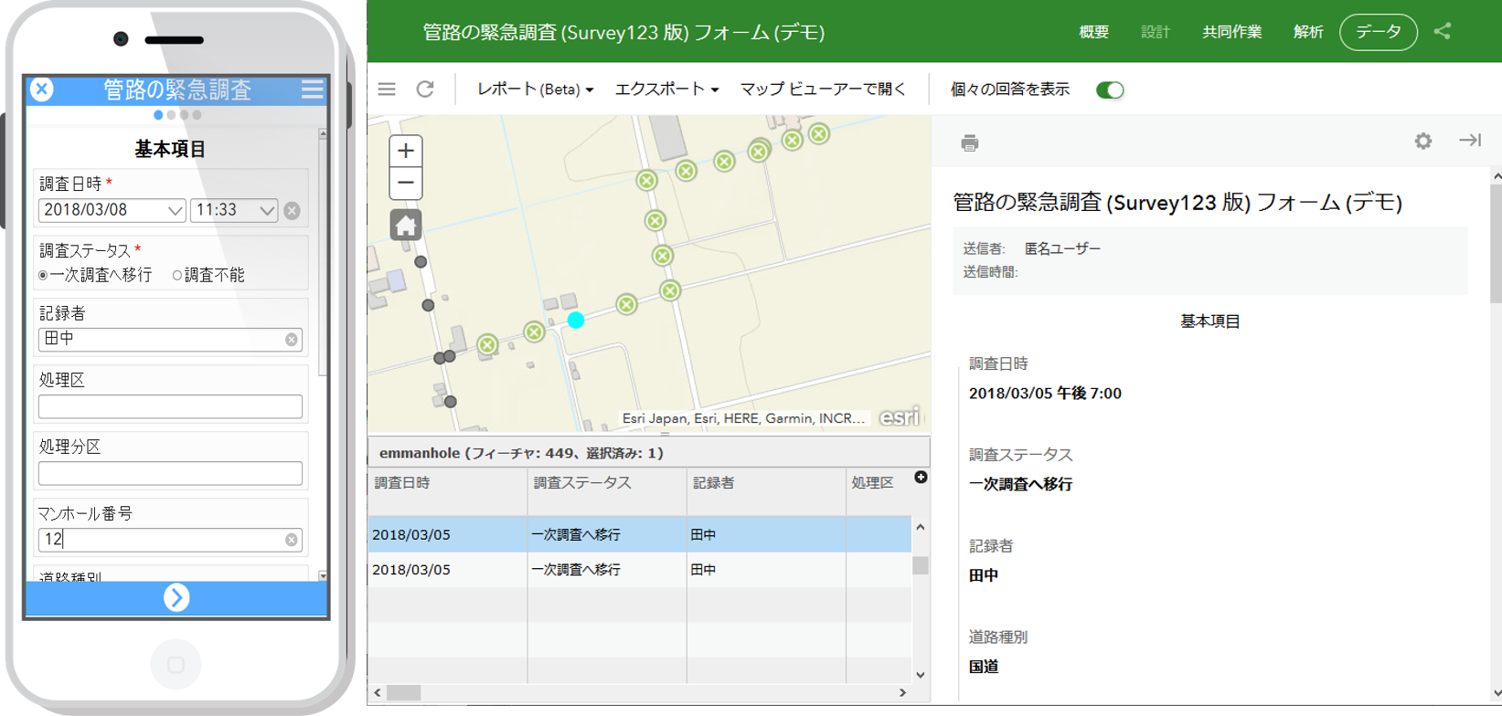 このテンプレートは ArcGIS ポータル(ArcGIS Online)を利用して、災害時の1次調査の事前調査 (0 次調査) としてマンホールおよびその周辺道路の被害情報を収集することができる現地調査ソリューションです。スマートフォンやタブレットなどのデバイスを用いて調査をおこない情報を収集することができます。