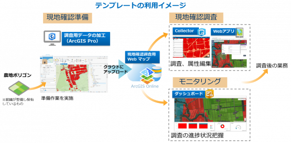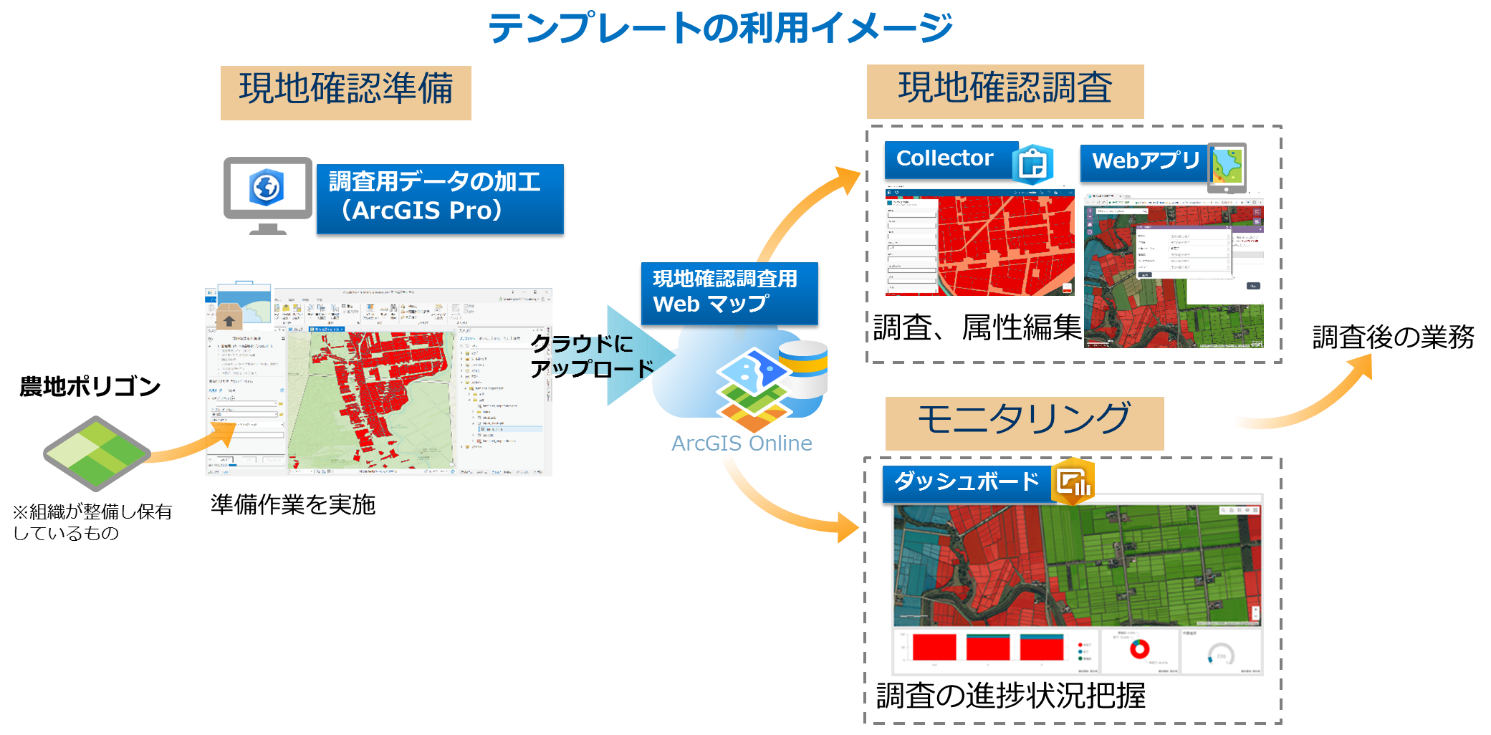 作付け調査テンプレートは ArcGIS ポータル(ArcGIS Online)を利用するテンプレートです。本テンプレートは、農業協同組合等の団体による、農業事業者から申請された作付けが適正に行われているか判断するための現地確認調査の効率化を目的として構成されています。作付け調査テンプレートを使用すると、一連の現地確認調査のフローをサポートする Web アプリを作成することができます。