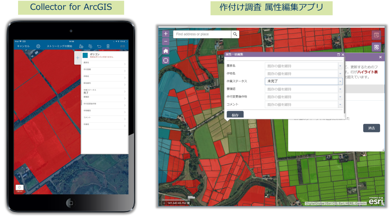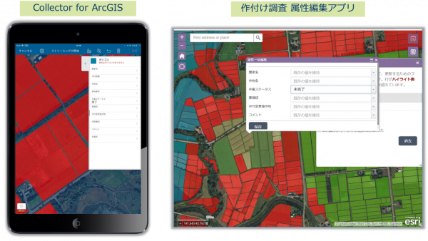 Collector for ArcGIS を使用して一筆ごとの確認結果を収集し、ArcGIS ポータル上に配置した GIS データに情報を蓄積できるように設計されています。また、多数の農地の現地確認調査を想定し Web AppBuilder for ArcGIS ベースで構築された属性一括編集用の Web アプリも提供します。