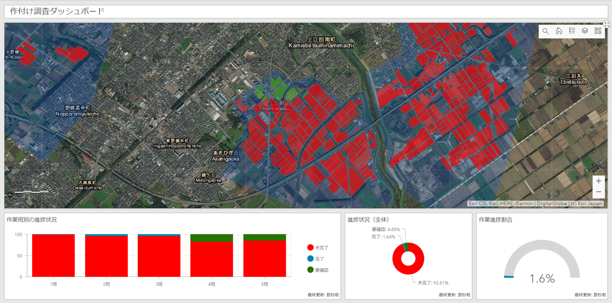 現地調査アプリを使用して収集したデータをリアルタイムに状態監視することができます。またダッシュボード上に配置されたグラフを通じて、作業班ごとの作付け調査の作業ステータスや全体の進捗状況等を確認することができます。