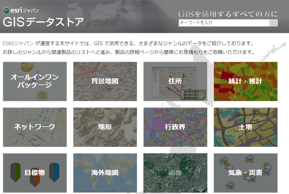 「GIS データストア」では、ESRIジャパンが提供する GIS ソフトウェア「ArcGIS」で活用できる、さまざまなジャンルのデータコンテンツを紹介しています。サイト閲覧者は、12 のジャンルから関連製品のリストへと進み、製品の詳細ページから簡単に特長や価格をご確認いただけます。今回、NTT空間情報の「GEOSPACE 電子地図」や「GEOSPACE CDS」など、6 製品を追加しました。