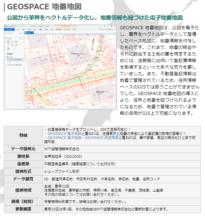 GIS データストア 製品情報画面例(GEOSPACE 地番地図)