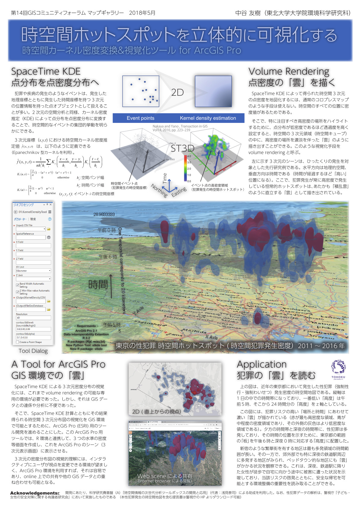 犯罪の発生が特定の地区に集中する犯罪のホットスポットの存在は、よく知られています。同時に、ホットスポットによって犯罪の多発する時間帯が異なることもあります。こうした犯罪や疾病のように時間と場所に依存してイベントが集中的に発生する状況が刻々と変化する現象を分かりやすく示す方法として、時空間カーネル密度変換の視覚化が提案されてきました。ArcGIS Pro環境で、この時空間密度変換を施し等密度面を3次元的に描き出すツールを開発しました。
